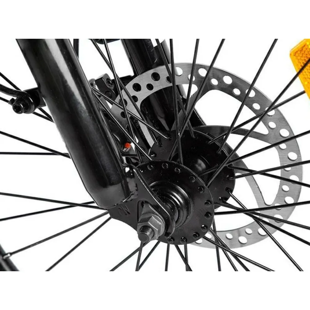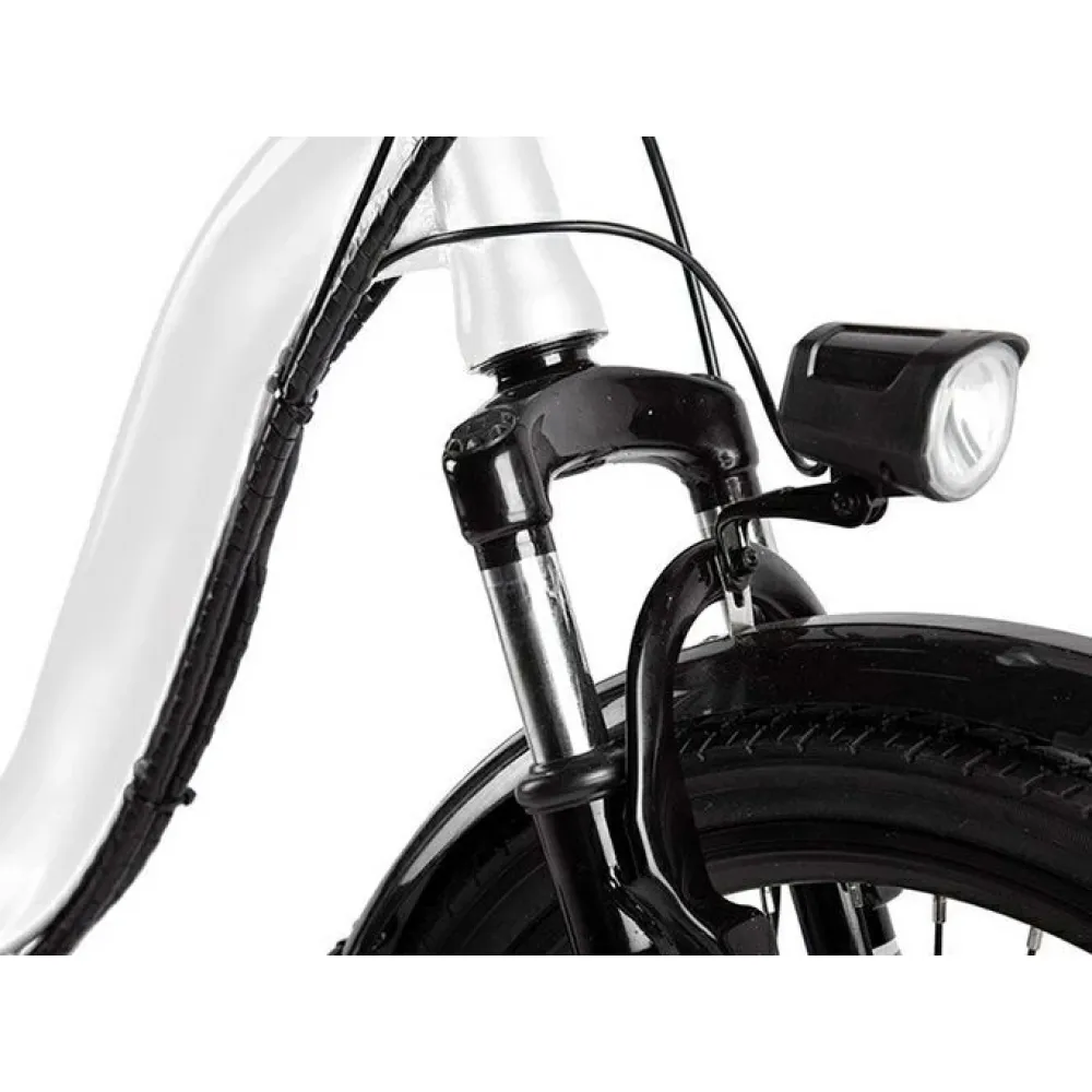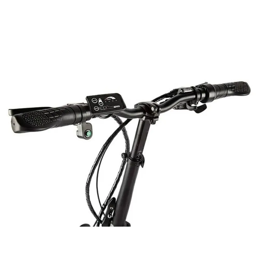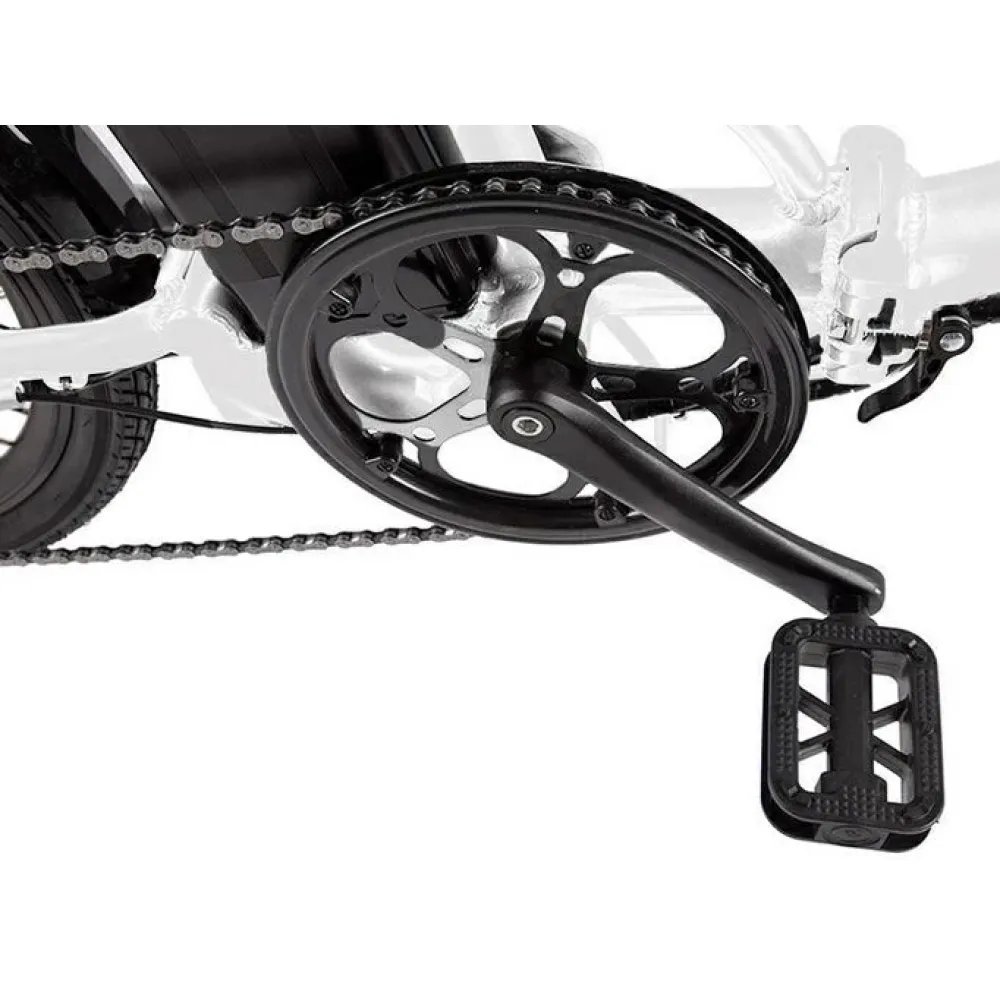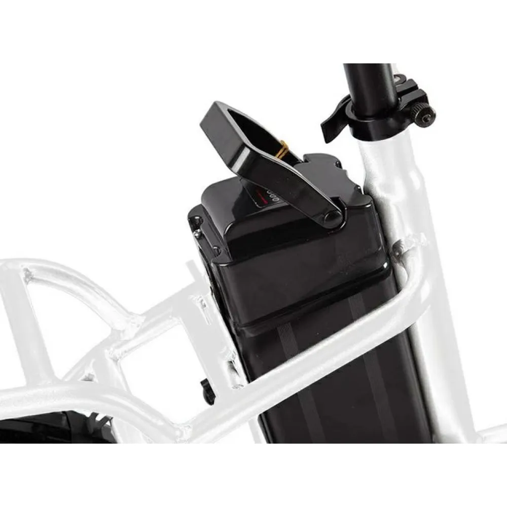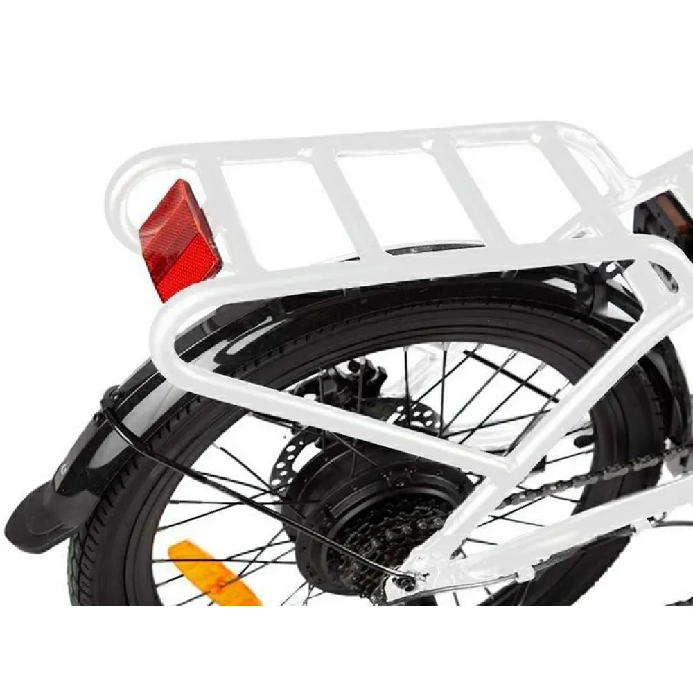 Модель оснащена современным электромотором на 250 Вт. При емкости АКБ 8А*ч максимальная скорость составляет 30 км/час, а максимальный запас хода 40 км. Аккумулятор размещен в специальном блоке за подседельной частью. Комфортное эргономичное седло регулируется по ростовым параметрам ездока. Максимальная грузоподъемность составляет 110 кг. 20-дюймовые колеса с 7-скоростной трансмиссией и амортизаторами готовы доказать, что скоростная накатистая езда на велогибриде возможна даже по неровной местности.
